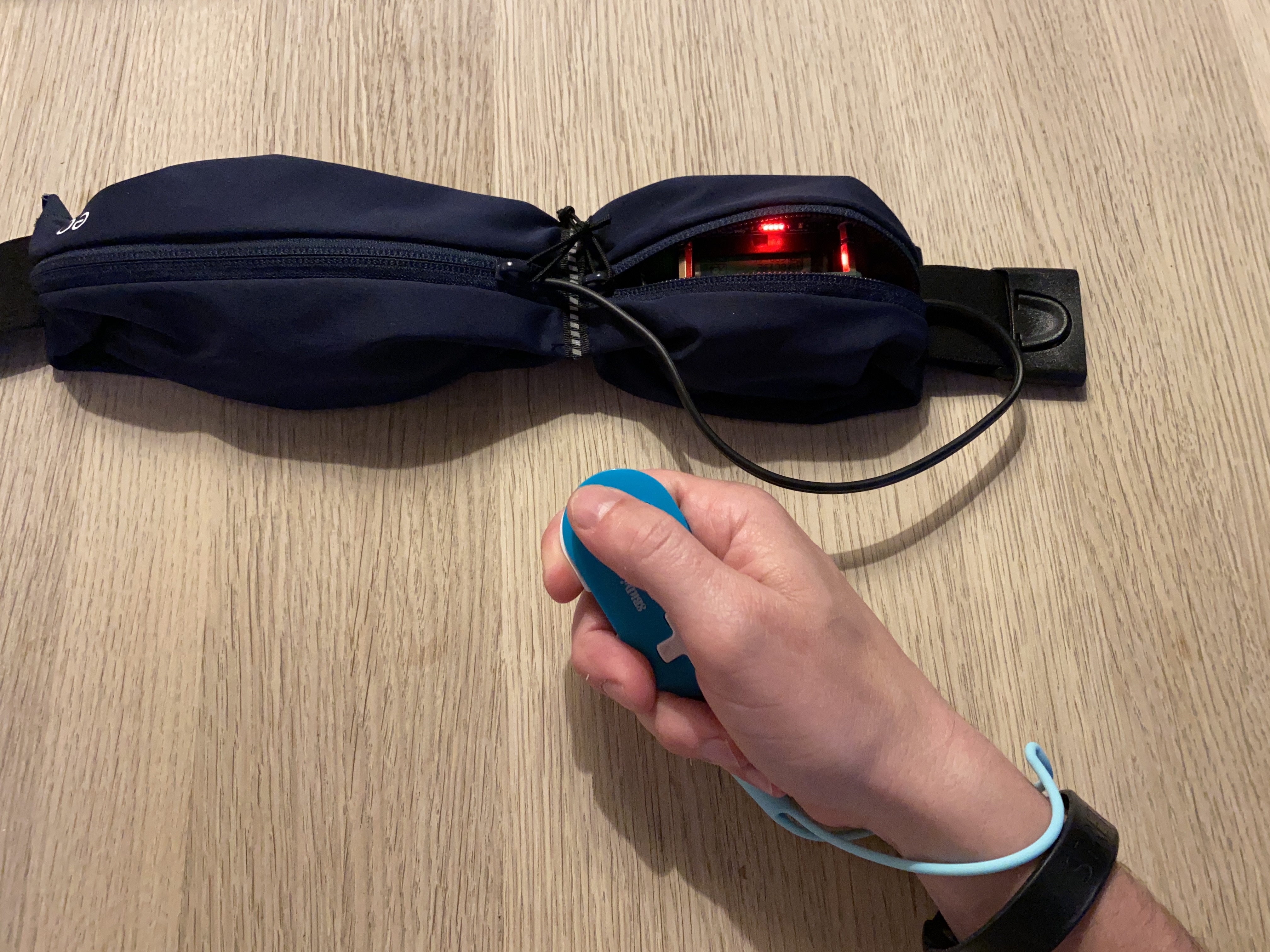 In order to deal for both issues, I acquired a compact wireless controller, which comes with a wrist strap. It seems to fit perfectly for use with the active muscle stimulator.